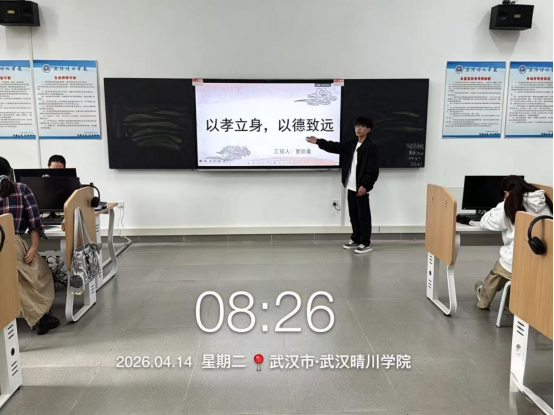 活动伊始,团支书曹劭鑫指出“孝是百善之先、立身之本,德是处世之基、长远之道,一个人只有先守孝、再修德,才能立身端正、行稳致远,成就圆满人生,也能惠及家庭、造福社会。”随后,同学们共同观看孝德主题宣传片,从“黄香温席”的古代典故到新时代孝老爱亲模范的感人事迹,直观感受孝文化跨越千年的生命力。随后进入本次活动的特色环节——中英双语孝德经典诵读,同学们用流利的中英双语诵读《论语》《弟子规》中的经典名句,在语言转换中锻炼专业能力,也从跨文化视角重新理解中华传统美德的普世价值。