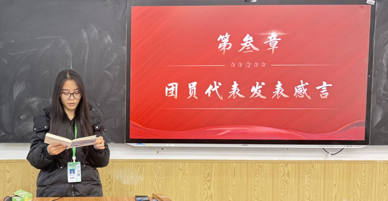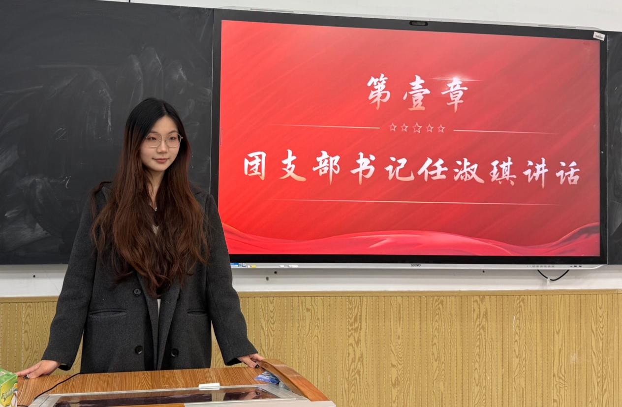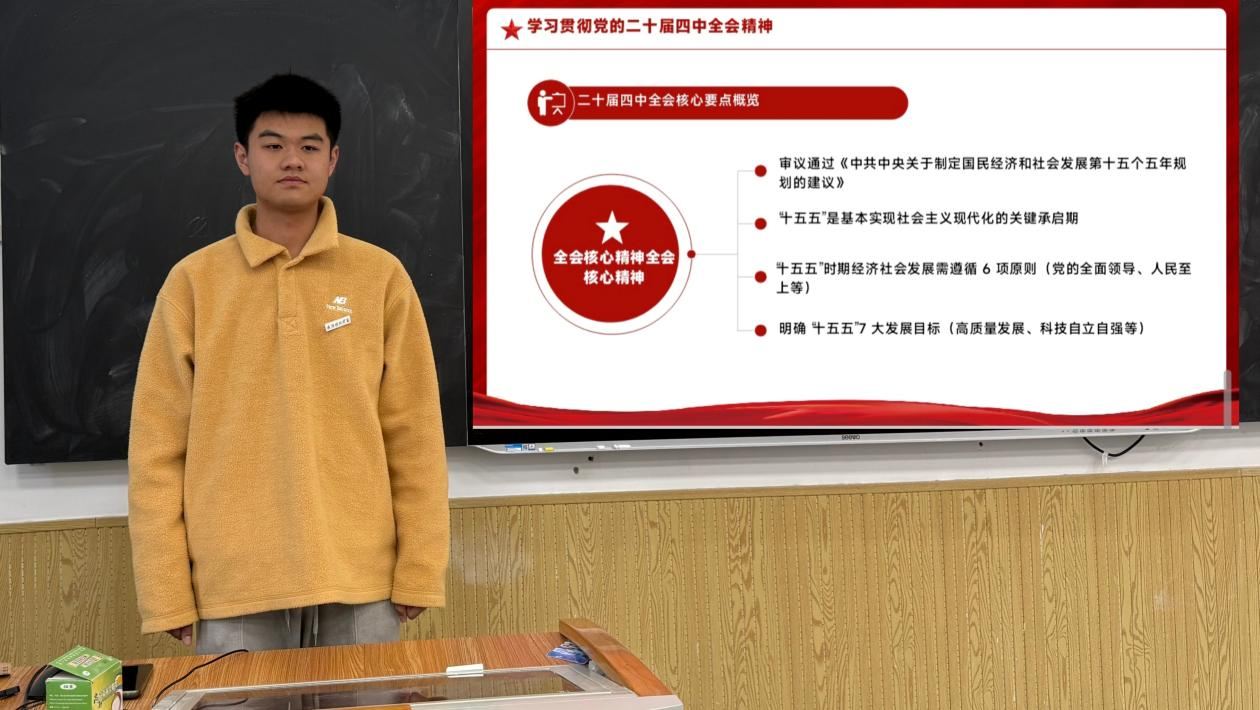 大会伊始,团支部书记任淑淇发表讲话,从“时代背景、青年责任、实践要求” 三个维度为团员们作思想引导。结合学生会 “服务同学、建设校园” 的工作定位,着重强调:“青年学习不能止于‘知’,更要落于‘行’。”她鼓励大家打破“理论与实践脱节”的壁垒,将党的二十届四中全会精神转化为日常工作的行动指南,在校园服务、活动统筹中践行青年担当,让理论学习真正“接地气、见实效”。