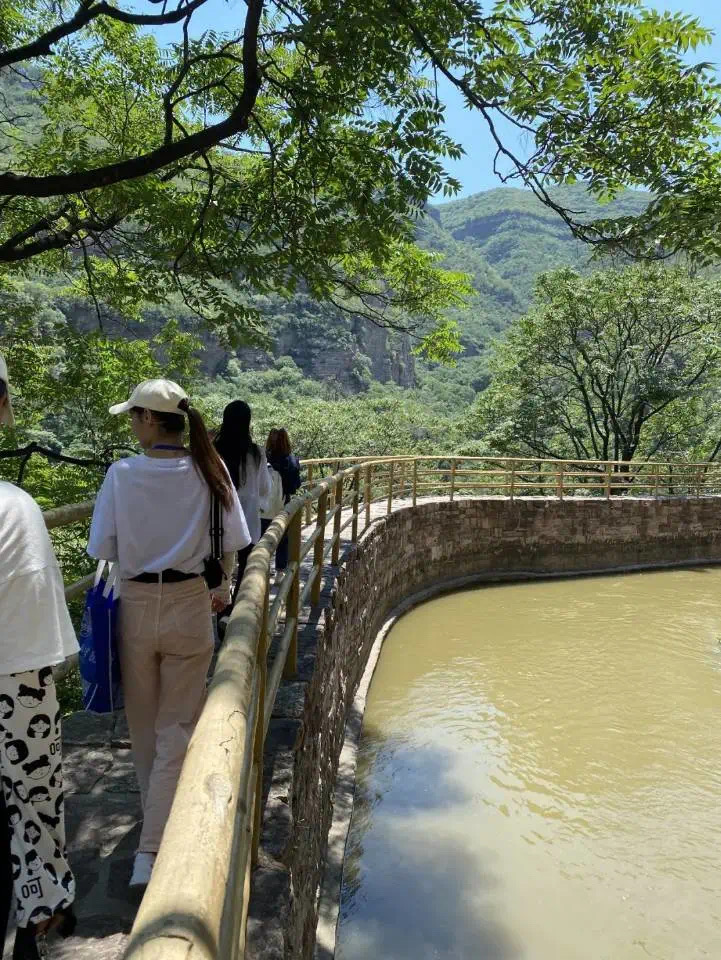 在青年洞的行程中,党支部成员步行数公里亲自探访青年洞。行走在不足两米宽的渠墙上,抬头是陡立的峭壁,俯首是数丈高的悬崖,在徒步中体验当年修渠民工们付出的艰辛。