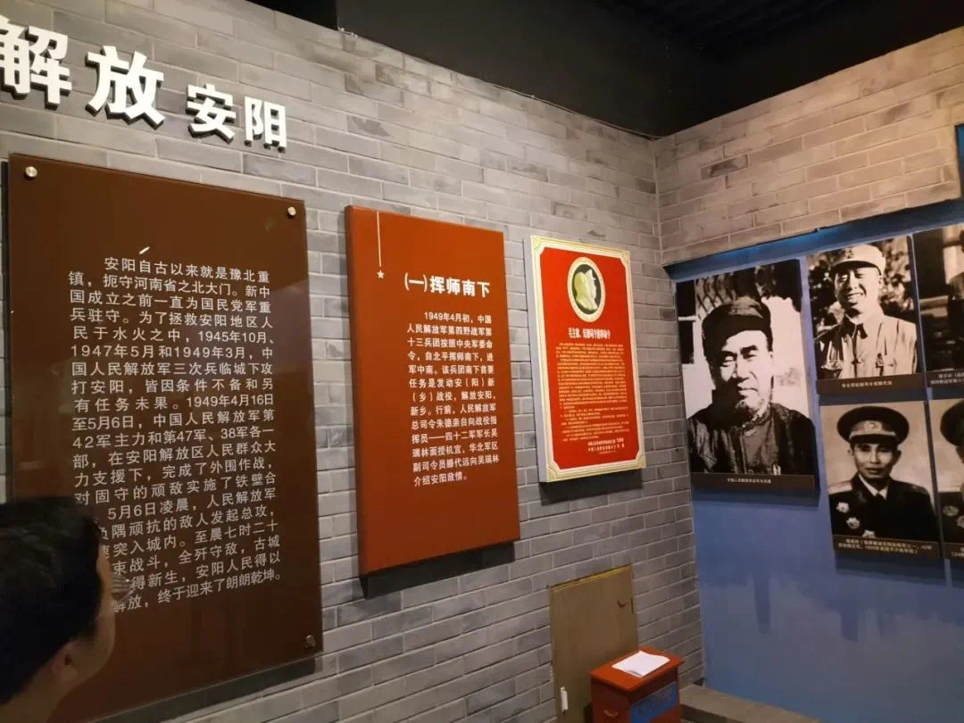 这一部分主要展示了解放战争时期中国共产党领导安阳人民与国民党反动派开展斗争的情况,包括解放安阳的斗争历程。这个展厅运用幻影成像科技技术手段将豫北战役中鏖战汤阴的战斗历程生动形象的展示在了参观者面前。解放安阳部分除了图片展示外,在声光电展示厅用电影技术手段向大家展示了解放安阳的具体过程。