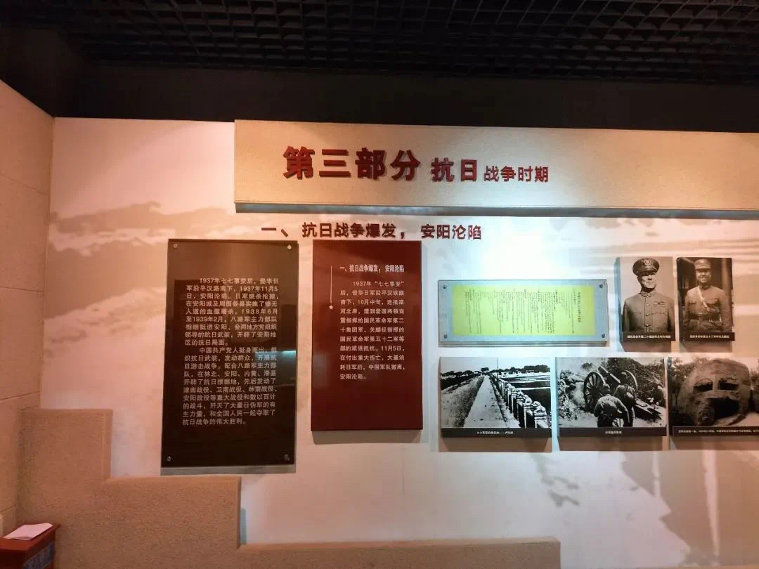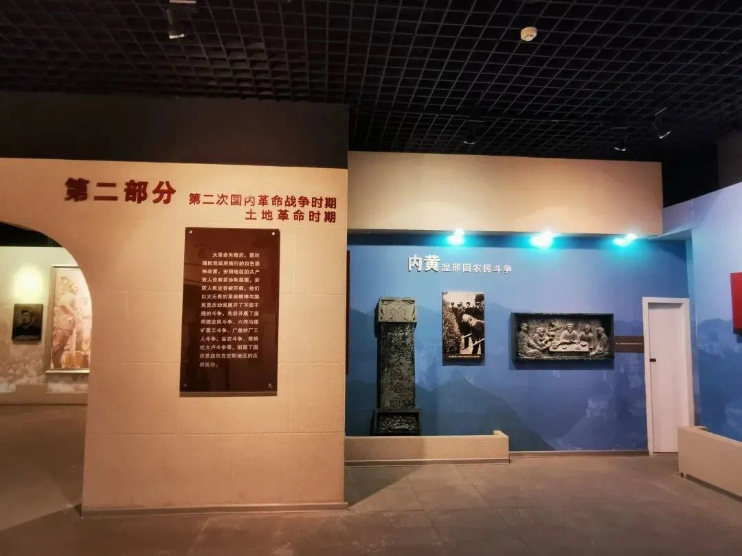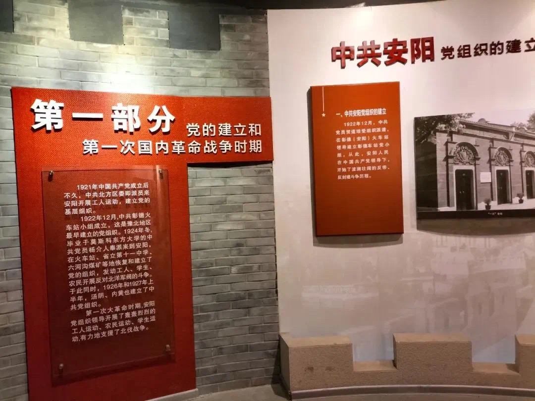 第一展厅主要展出了三部分内容,第一部分为党的建立和第一次国内革命战争时期。第二部分讲述的是第二次国内革命战争时期。第三部分讲述的是抗日战争前期安阳的革命历史。中厅主要展示抗日战争后期。