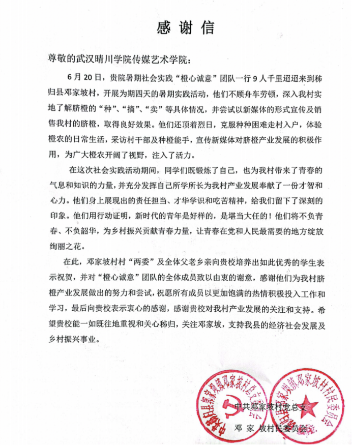 2022年6月20日起,武汉晴川学院传媒艺术学院“橙心诚意”团队于湖北省宜昌市秭归县郭家坝镇邓家坡村开展了为期4天的暑期社会实践活动。