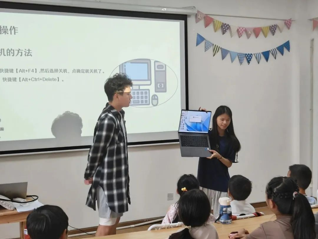 7月15日,计算机学院“筑梦新翼团”社会实践队成员为江夏区腾龙社区的孩子们带来了生动有趣的计算机课程。他们鼓励孩子们在课堂上勇于发声,使课堂气氛更加轻松。课堂上,孩子充满热情,积极参与讨论。团队成员手持电脑,耐心地为同学们逐一演示快捷键的神奇之处。团队成员让抽象的理论知识跃然眼前,引领孩子们踏入人工智能的奇幻世界。从chatgpt的前沿技术到生成图模型的无限可能,每一个概念都如同星辰般璀璨,激发了孩子们对未来科技的无限遐想。