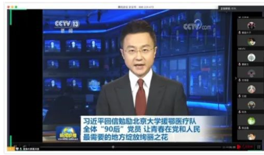 首先,团支书从网上找了习近平总书记给北京大学援鄂医疗队全体“90后”党员回信的相关视频,并学习了相关的意义:在这次抗击疫情的斗争中,以“90后”为代表的青年一代挺身而出、担当奉献,充分展现了新时代中国青年的精神风貌。向援鄂医疗队青年党员和广大团员青年及卫生健康系统广大青年党团员致敬!