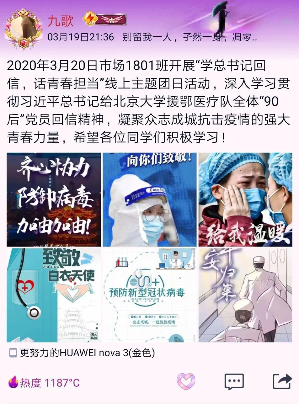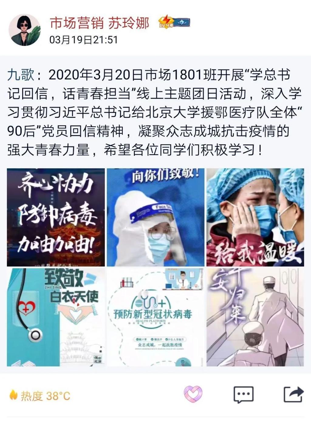 3月15日,习近平总书记给北京大学援部医疗队全体“90后”党员回信,向他们和奋斗在疫情防控各条战线上的广大青年致以诚挚的问候。他在回信中表示,“广大青年用行动证明,新时代的中国青年是好样的,是堪当大任的!”既表达了对青年战“疫”成绩的高度赞扬,也体现了党中央对当代青年的殷切期待。为深入学习贯彻习近平总书记给北京大学援鄂医疗队全体“90后”党员回信精神,凝聚众志成城抗击疫情的强大青春力量,我班开展“学总书记回信,话青春担当”线上主题团日活动。