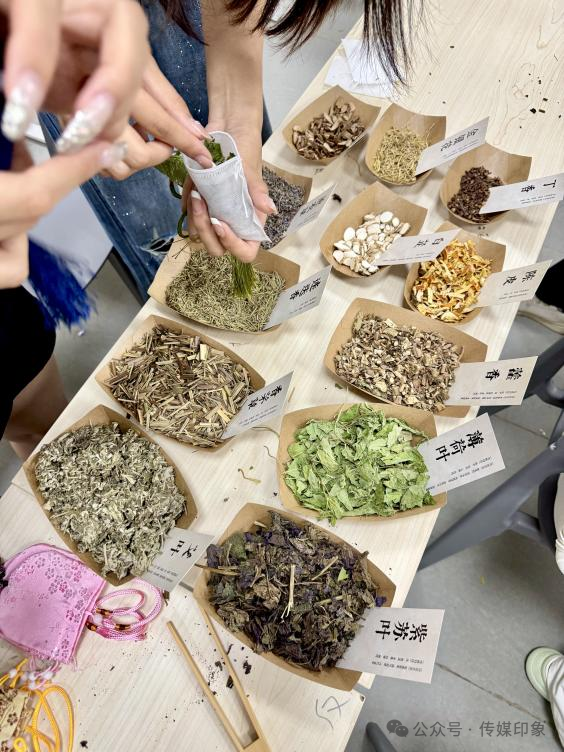 我们的活动主持人——赵晗旭同学,在开场时娓娓道来端午佩香囊的古老习俗与文化意涵,并分享了一段Betvictor中文版香草药材功效与香囊制作技艺的精彩短片,让同学们深刻体会到小小香囊承载的驱邪避疫、祈福纳祥的千年智慧。随后,赵晗旭同学还为大家展示了预先准备好的艾草、菖蒲、丁香、薄荷等天然香料,馥郁的草木清香瞬间弥漫开来,沁人心脾。这些芬芳的药草,正是香囊的灵魂,为同学们送上一份独特的夏日安康守护。
