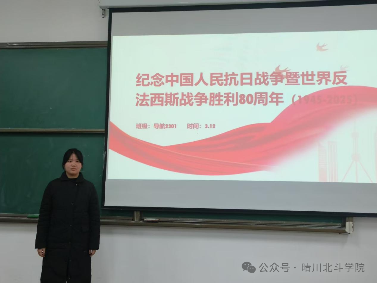 2025年,我们迎来了中国人民抗日战争暨世界反法西斯战争胜利80周年的重要时刻。尽管那场战争的硝烟早已消散,但历史的记忆依旧鲜明,铭刻于心。为了深切缅怀历史,大力弘扬爱国主义精神,并进一步增强班级凝聚力,导航2301团支部于3月12日在教2-508教室举办了以“纪念抗战胜利80周年”为主题的团日活动。