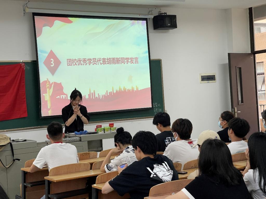 团课持续推进,接下来由团校优秀学员代表胡雨新同学发言。胡雨新同学首先向同学们介绍中国共产主义青年团的地位及作用,希望同学们都能够珍惜机会,在学习团课的过程中,能够将知识学以致用,全面发展自己。随后她借用梁启超老先生的《少年中国说》中的话,将少年比作朝阳,比作乳虎,比作泼兰地酒,比作春前之草,无不透露着年轻一代的朝气蓬勃。胡雨新同学以此篇文章和大家共勉,希望在场的同学要不断的提高自己,不断地加强自身思想道德修养,不断地增强政治意识、组织意识和模范意识,做一名新时期的有为青年。最后胡雨新同学在次向各位同学郑重承诺自己也将以身作则,并预祝本次团校培训取得圆满成功!
