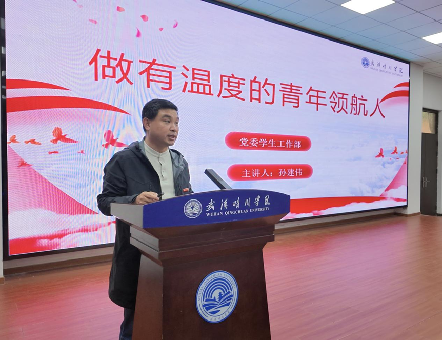 2024年11月6日12:00,武汉晴川学院第四期“青马工程”培训班暨第十四期校园干培训班第四讲于综2-105顺利开展。本次培训由武汉晴川学院党委学生工作处处长孙建伟同志主讲,主题为《做有温度的青年领航人》。