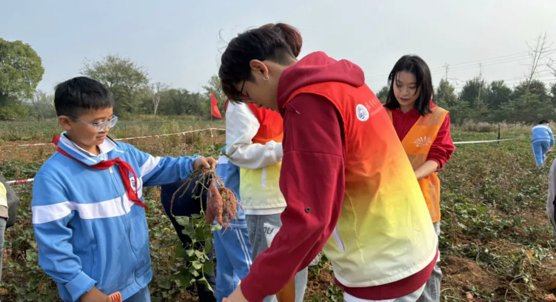 手工制作环节,晴川青年志愿者带领龙泉小学学生们于教育基地周边收集果实、树叶,共制果实风铃,进一步激发小朋友们创造力与想象力,精美的手工作品也成为活动的珍贵纪念。晴川青年志愿者代表、龙泉小学学生代表、“五老”志愿者共同参与活动,亲身体验劳动的艰辛与乐趣,深刻体会到了“一粥一饭,当思来处不易”的深刻内涵。