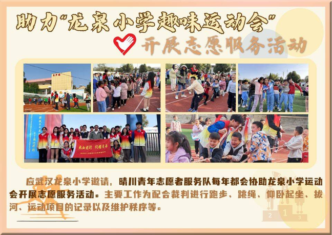 应武汉龙泉小学邀请,晴川青年志愿者服务队每年都会协助龙泉小学运动会开展志愿服务活动,主要工作为配合裁判进行跑步、跳绳、仰卧起坐、拔河,运动项目的记录以及维护秩序等。
