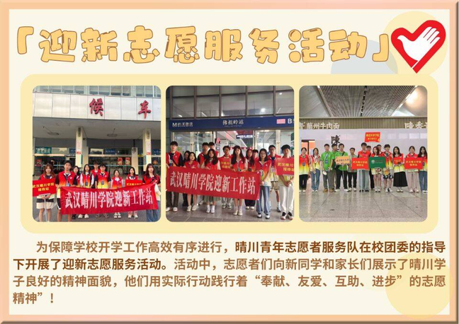 为保障学校开学工作高效有序进行,晴川青年志愿者服务队在校团委的指导下开展了迎新志愿服务活动,活动中,志愿者们向新同学和家长们展现了晴川学子良好的精神风貌,他们用实际行动践行着“奉献、友爱、奉献、进步”的志愿精神。