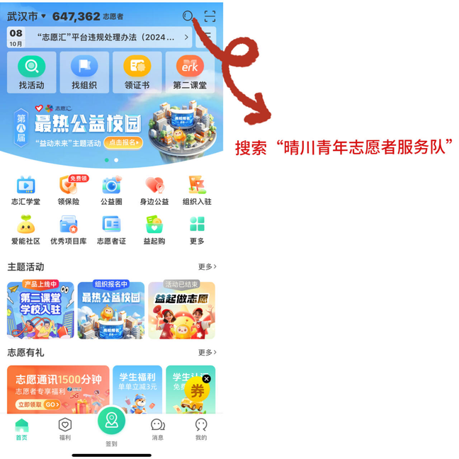 一、在首页点击左上角“找组织”,搜索查找“晴川青年志愿者服务队”。