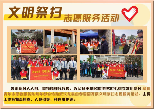 文明新风人人创,雷锋精神代代传。为弘扬中华民族传统文化,树立文明新风,晴川青年志愿者服务队每年都会协助武汉龙泉山孝恩园开展文明祭扫志愿服务活动,主要工作为物品检查、人员引导、秩序维护等。