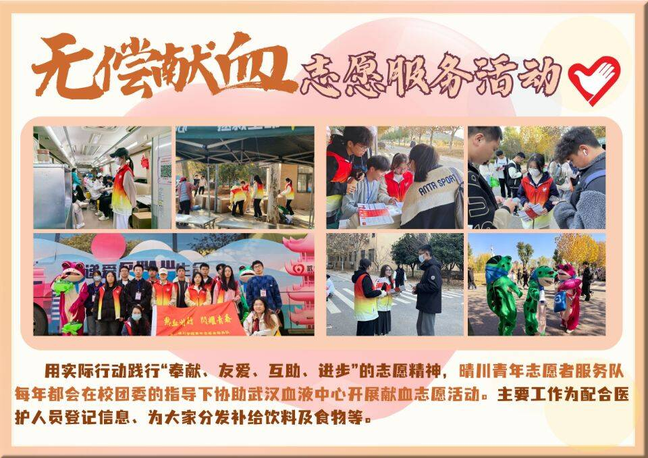 用实际行动践行“奉献、友爱、互助、进步”的志愿精神,晴川青年志愿者服务队每年都会在校团委的指导下协助武汉血液中心开展献血志愿活动,主要工作为配合医护人员登记信息,为大家分发补给饮料及食物等。