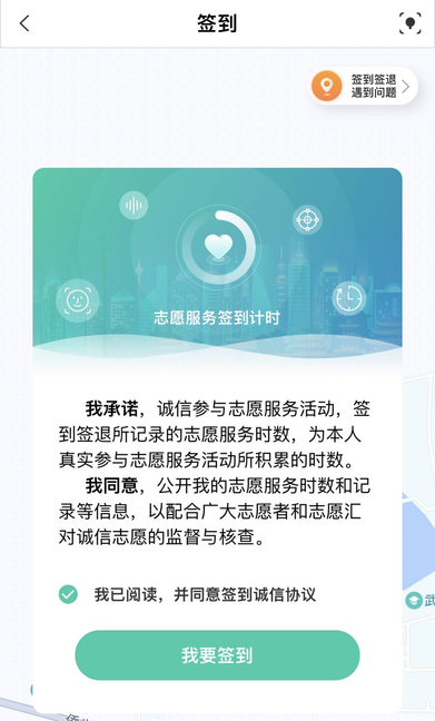 一、打开志愿汇,点击底部“签到”按钮,签署诚信协议,点击“我要签到”。