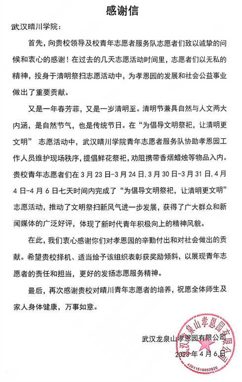 校地共建,携手共进。武汉龙泉山孝恩园有限公司为感谢武汉晴川学院青年志愿者服务队的同学们在清明期间提供的帮助,在活动结束后,用一封感谢信来高度评价了本次志愿活动。